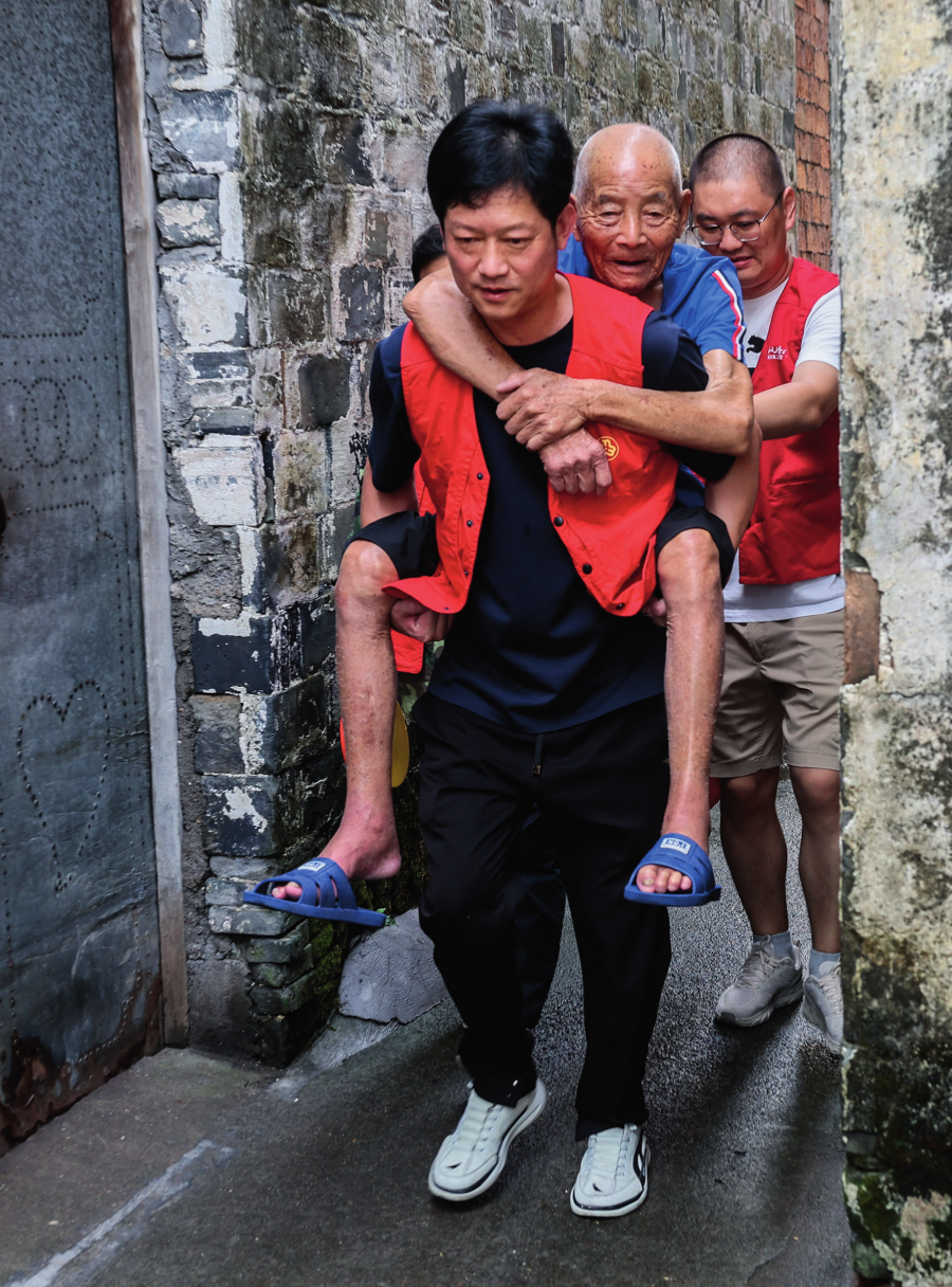 浙江省诸暨市赵家镇泉畈村村干部和党员志愿者在台风来临前转移危旧房里的老人(2024年9月19日摄)。徐昱摄/本刊
