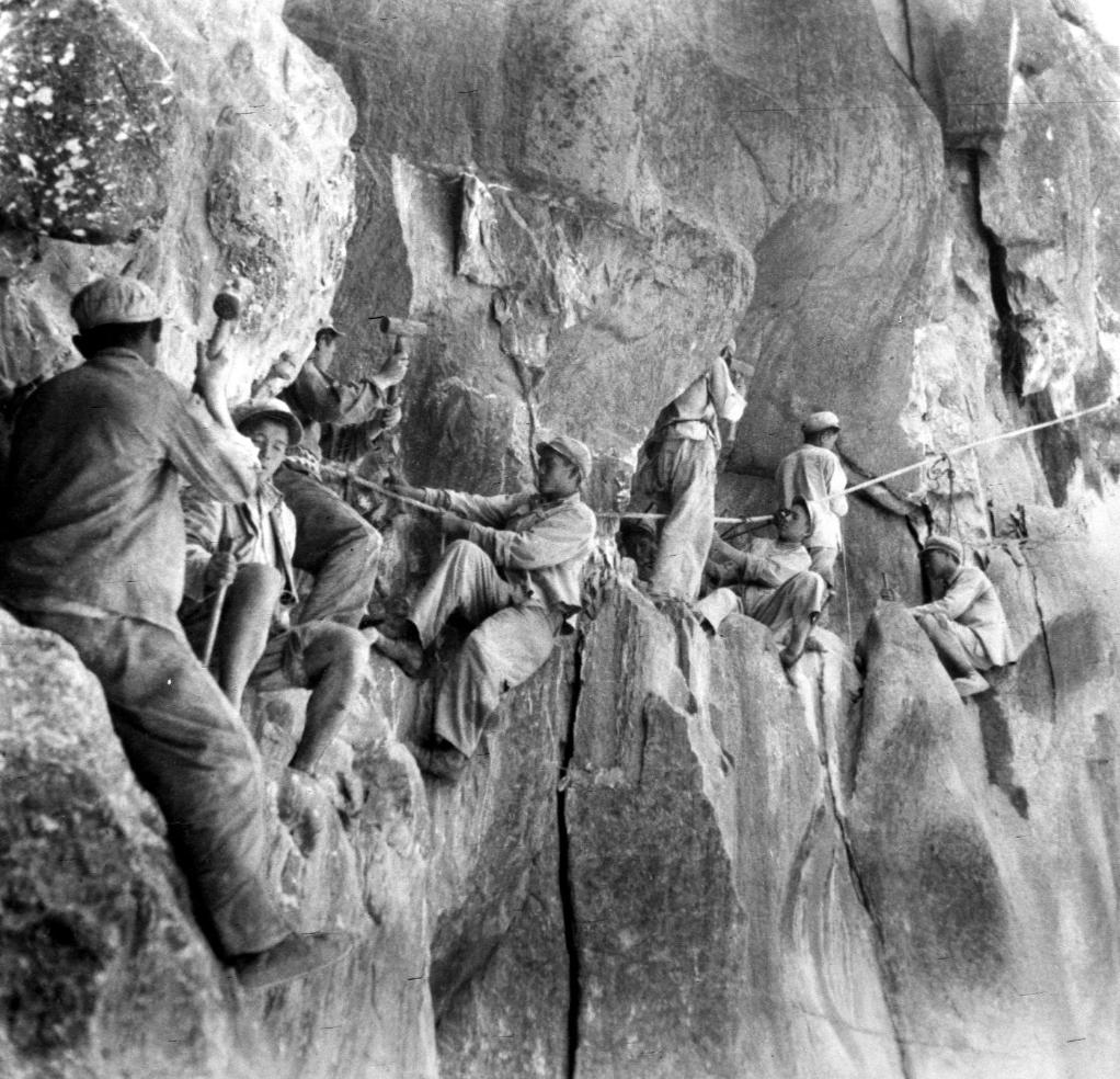 筑路战士在怒江两岸的悬崖陡壁上辟山筑路(资料照片)。新华社发