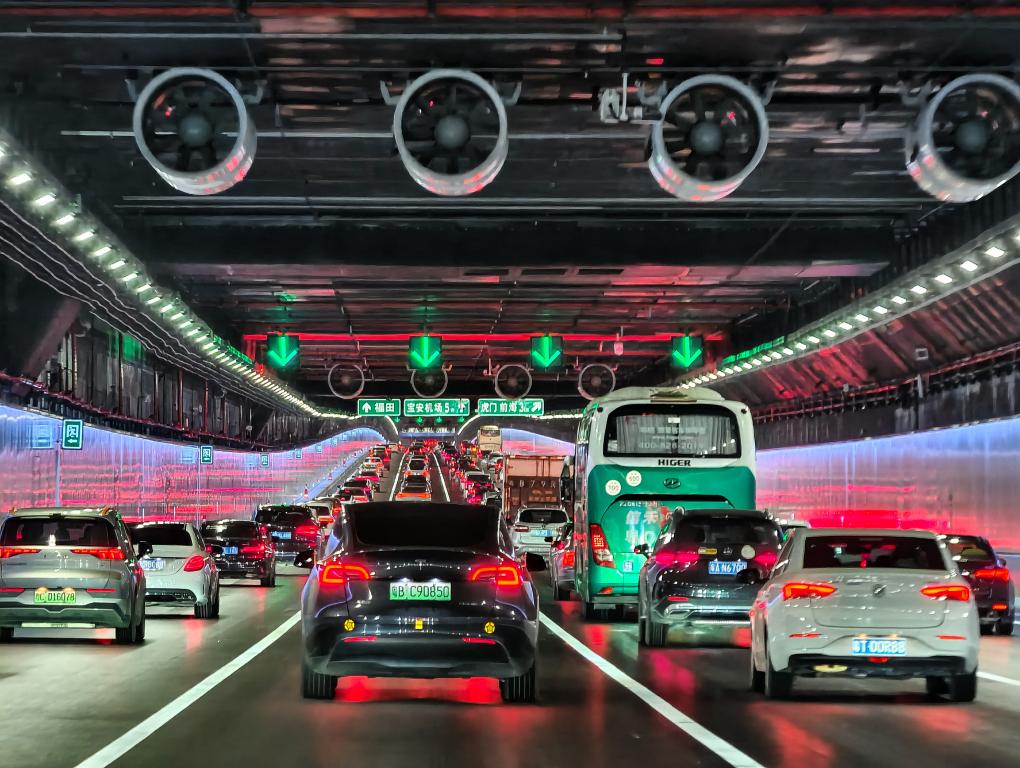 这是2024年6月30日开通首日的深中通道海底沉管隧道内的车流。新华社记者 刘大伟 摄