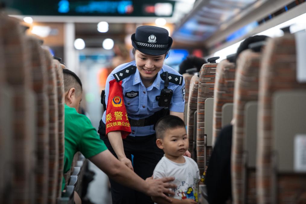 2024年6月15日,在武汉至深圳北的G875次列车上,乘警在引导小朋友回到座位。新华社记者 伍志尊 摄