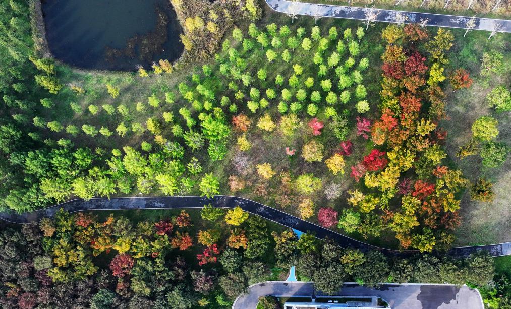 2024年10月28日,位于长江扬州段一处“口袋公园”秋景(无人机照片)。金秋时节,神州大地层林尽染,色彩斑斓,秋色宜人。新华社发(孟德龙 摄)