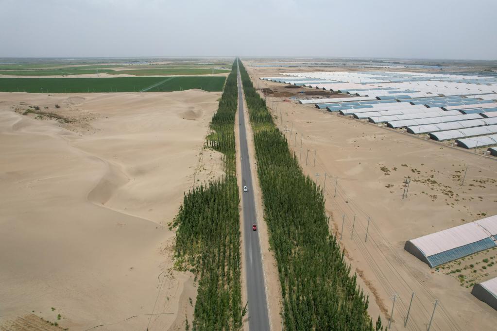 这是2024年6月20日拍摄的新疆和田地区和田县的防护林带,道路两边是沙漠饲草基地和设施农业基地(无人机照片)。新华社记者 丁磊 摄