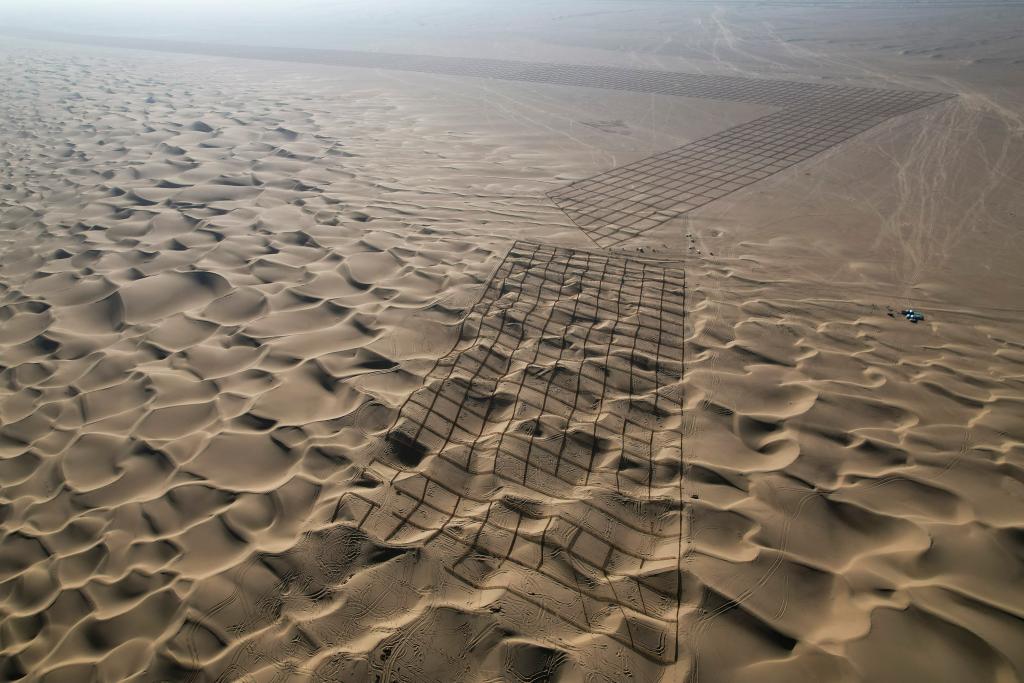 2024年11月27日,在新疆和田地区皮山县科克铁热克镇至叶城县方向沙漠“锁边”空白区,施工人员在搭建高立式沙障(无人机照片)。新华社发(邹懿 摄)