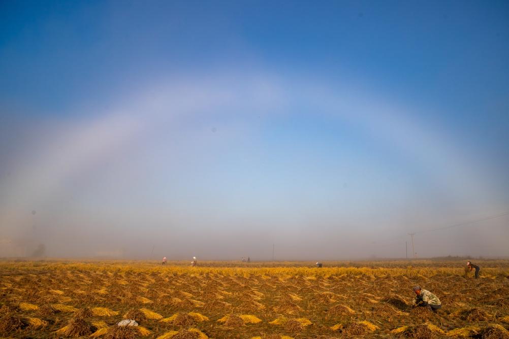 2024年9月26日,在上官地村,村民在雾气中收割水稻。