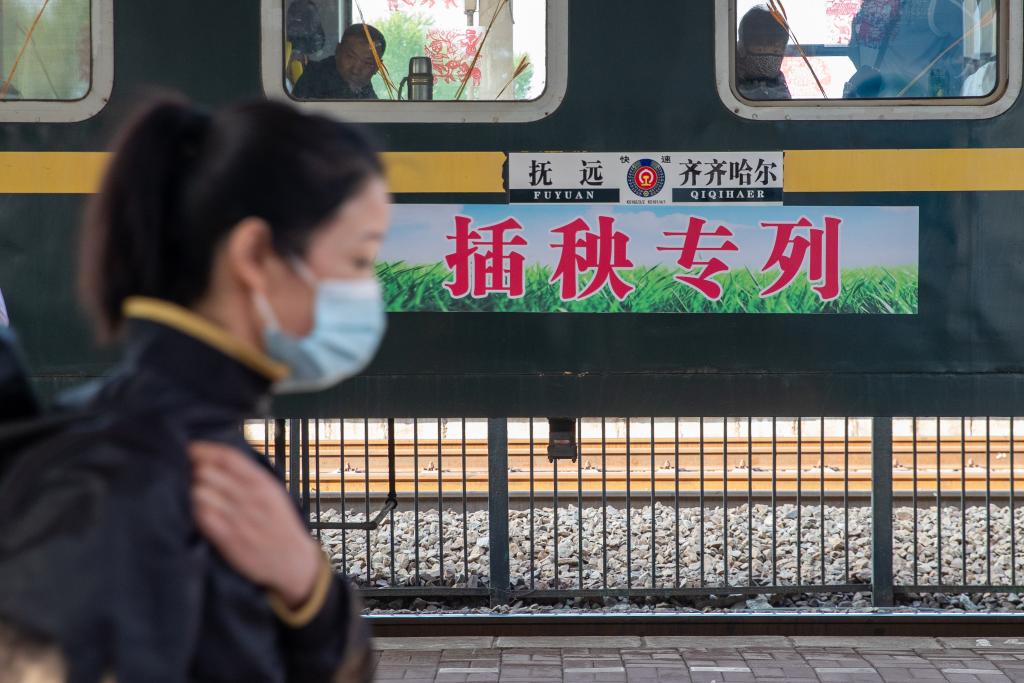 2024年5月7日,在绥化火车站,插秧客准备登上“插秧专列”。