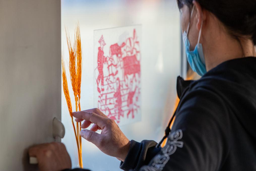 2024年5月8日,在“插秧专列”K5161次列车车厢,一名插秧客触摸列车装饰品。