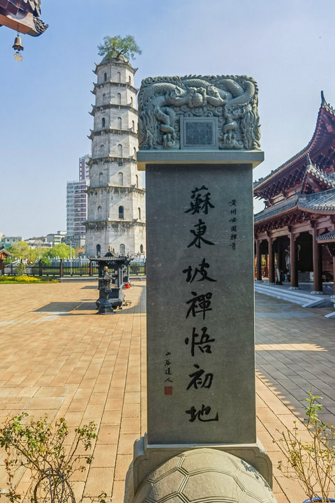 带着未想明白的问题,我们来到约3公里之南的安国寺。安国寺也是几经毁建,至今在原址上保持了“茂林修竹、陂池亭榭”的状态。寺内殿宇一角立着一块石碑,上书“苏东坡禅悟初地”。现任安国寺住持崇谛法师是一位哲学博士,前一天刚从法国开展文化交流回来,谈起东坡功业的话题,他说可从“禅悟初地”入手理解。