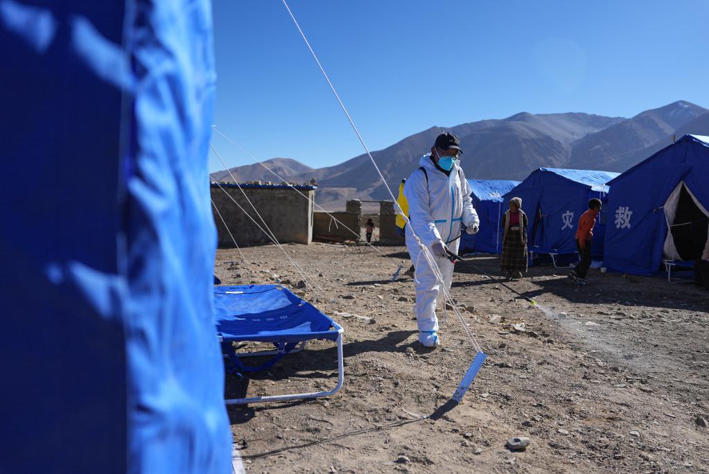 1月8日,医护人员在日喀则市定日县措果乡野江村进行消杀。(新华社记者 晋美多吉 摄)