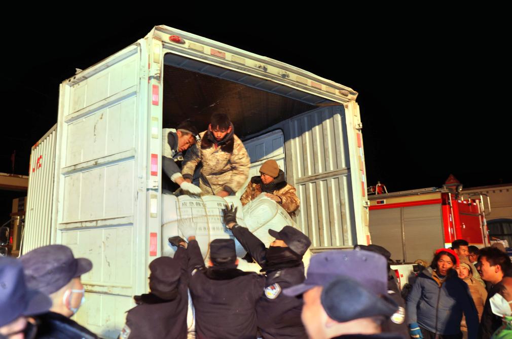 1月8日,在定日县人民政府的救援物资点,干部群众接力传递救援物资。(新华社记者 丁汀 摄)