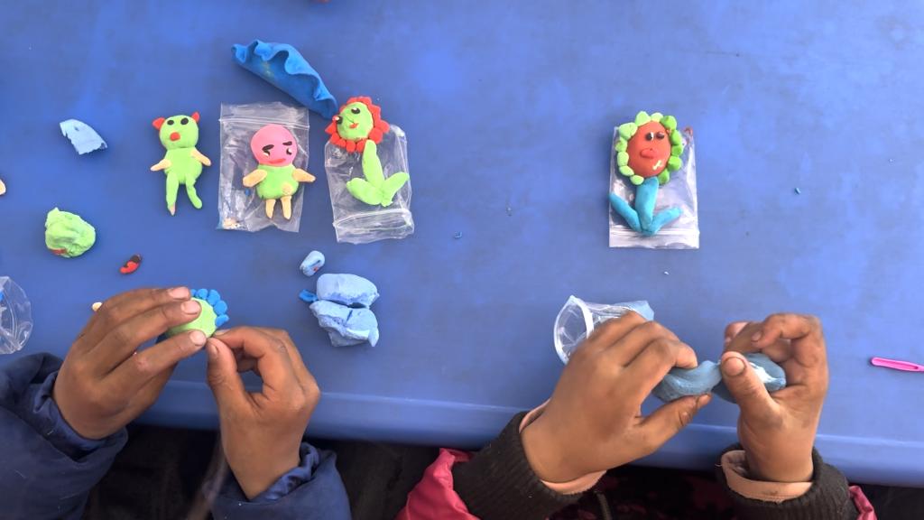 1月13日中午,在定日县曲洛乡措娃村安置点的儿童友好空间,孩子们在社工指导下捏塑超轻黏土。新华社记者索朗德吉 摄