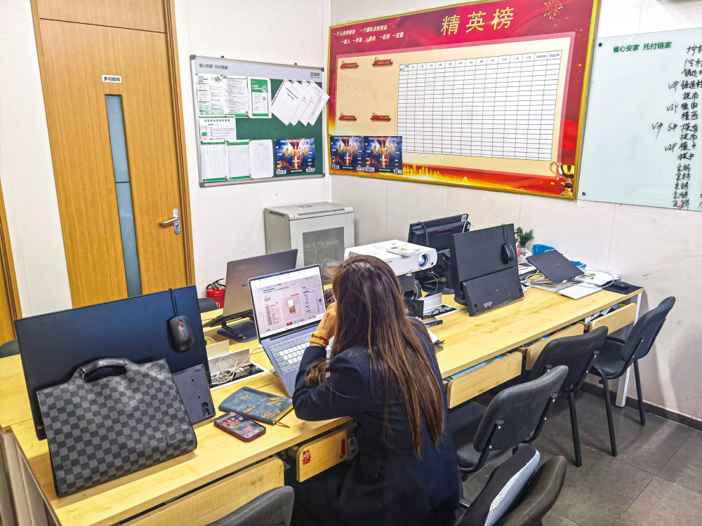 “满打满算还有两周就放假了,大家注意及时回应业主和客户的信息,大家加油!”房产经纪人和店长围站一圈,为一天的工作提示打气。