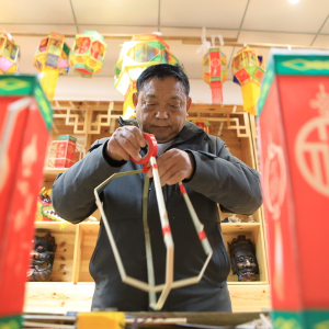 图为1月17日,秀山花灯代表性传承人彭兴茂在位于秀山西街的非遗体验馆内展示扎花灯技艺。新华社发(胡程摄)