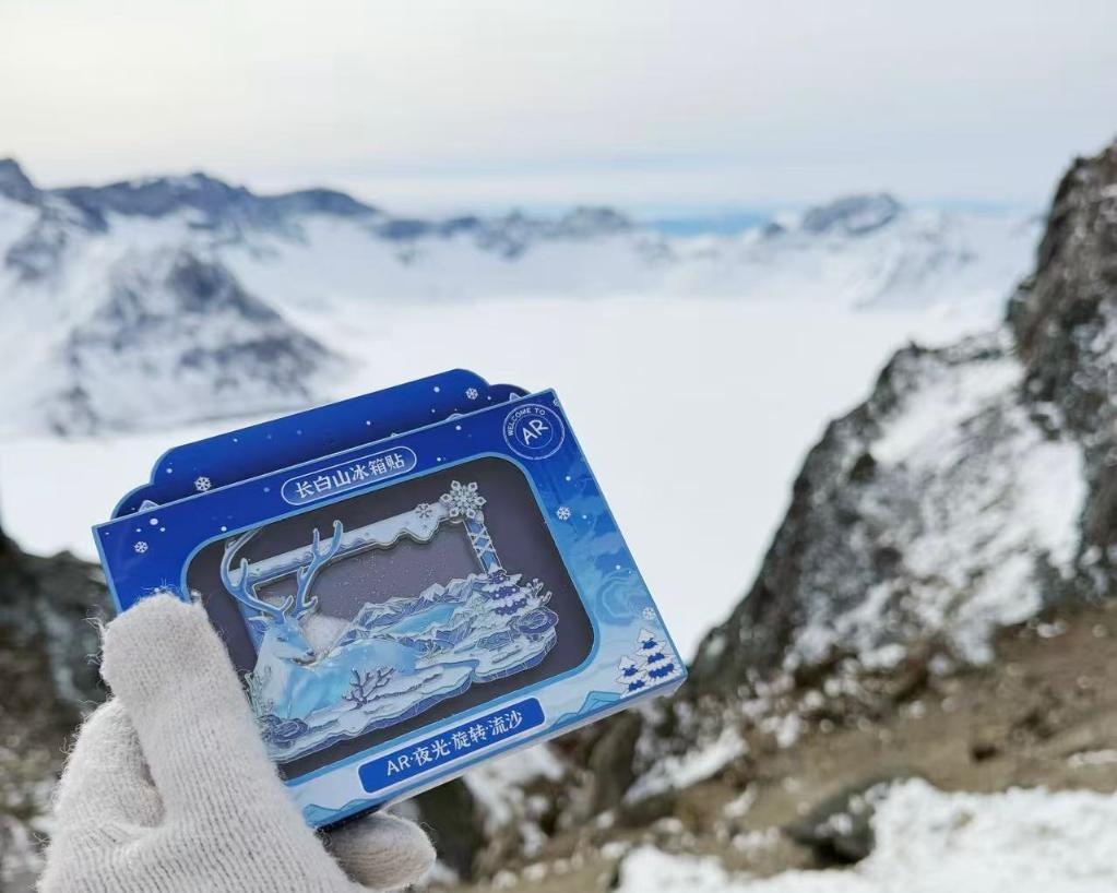 镇上一家文创店里,人头攒动。蓝白两色的冰雪天池,在淌着流沙的冰箱贴上复现,成为游客春节回家争相带走的伴手礼。这款冰箱贴的设计者杨奕,正和文创店老板王燕畅聊着白天天池采风的感受与新一年的设计规划。