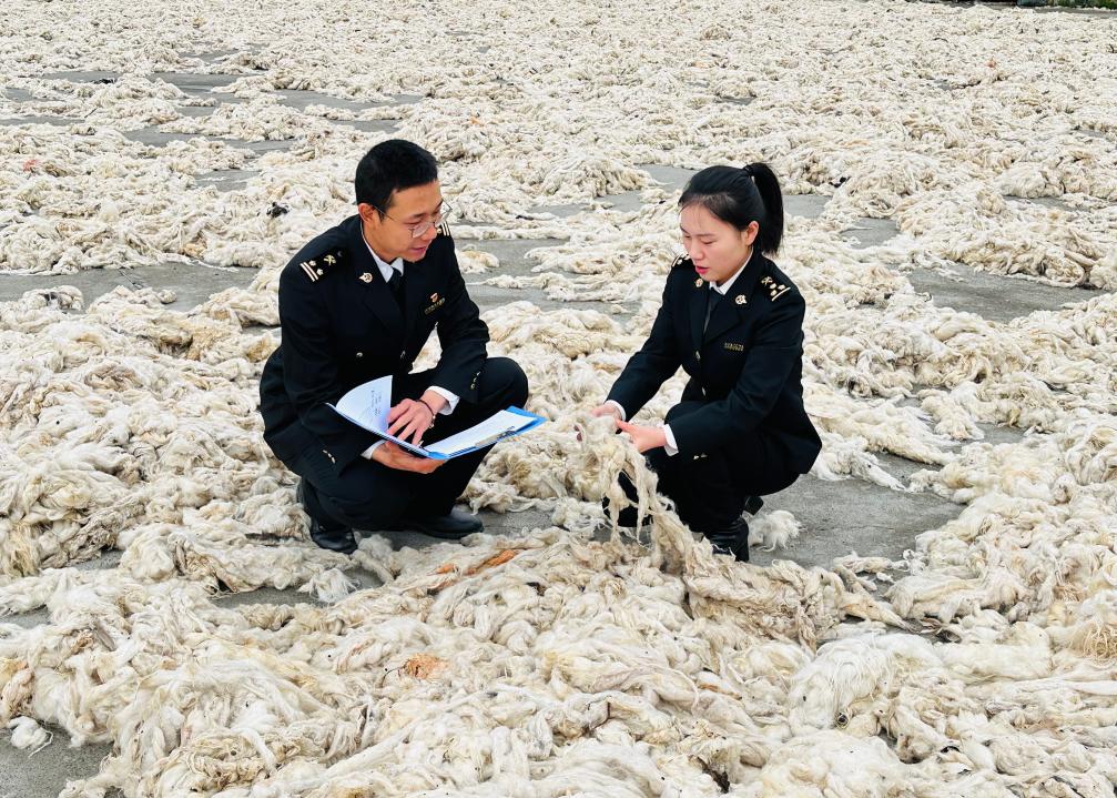 拉萨海关所属八廓海关关员在外贸企业调研西藏羊毛羊绒。(拉萨海关供图)