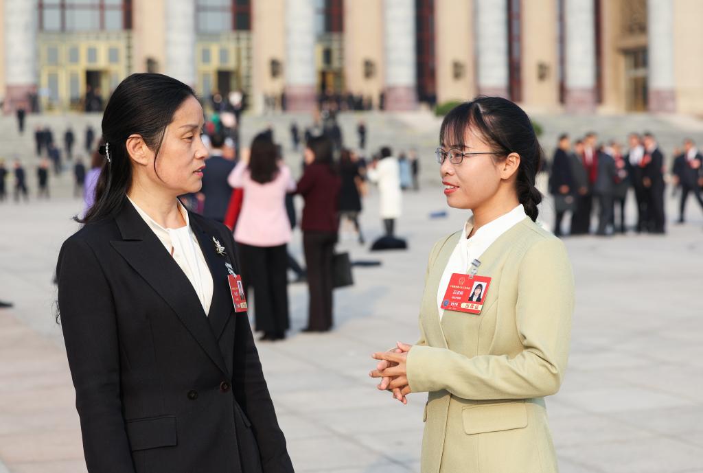 3月5日,全国人大代表田淑娴(右)和全国人大代表毕利霞在人民大会堂前交谈。