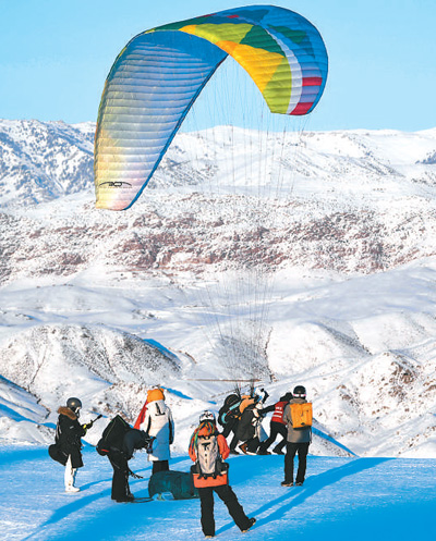 游客在将军山国际滑雪度假区体验滑翔伞。新华社记者 胡虎虎摄