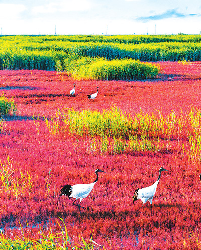 经过多年努力,红海滩国家风景廊道的湿地修复取得了显著成效——景区内候鸟、留鸟数量明显增多,许多丹顶鹤由“过客”变“留客”;2018年景区内碱蓬草覆盖面积为2000亩,如今已实现景区18公里范围内基本覆盖。
