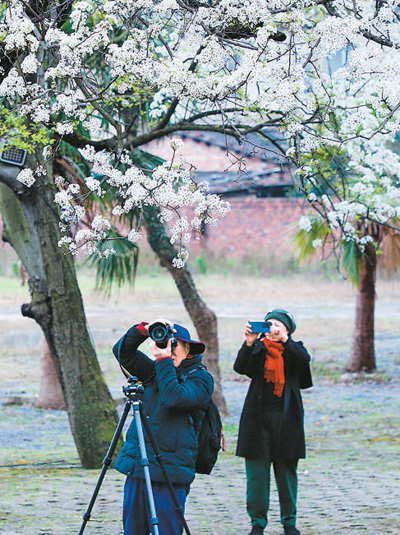 甲宅村桃花岩景区内,盛放的梨花吸引游客拍照观赏。秦艳涛摄