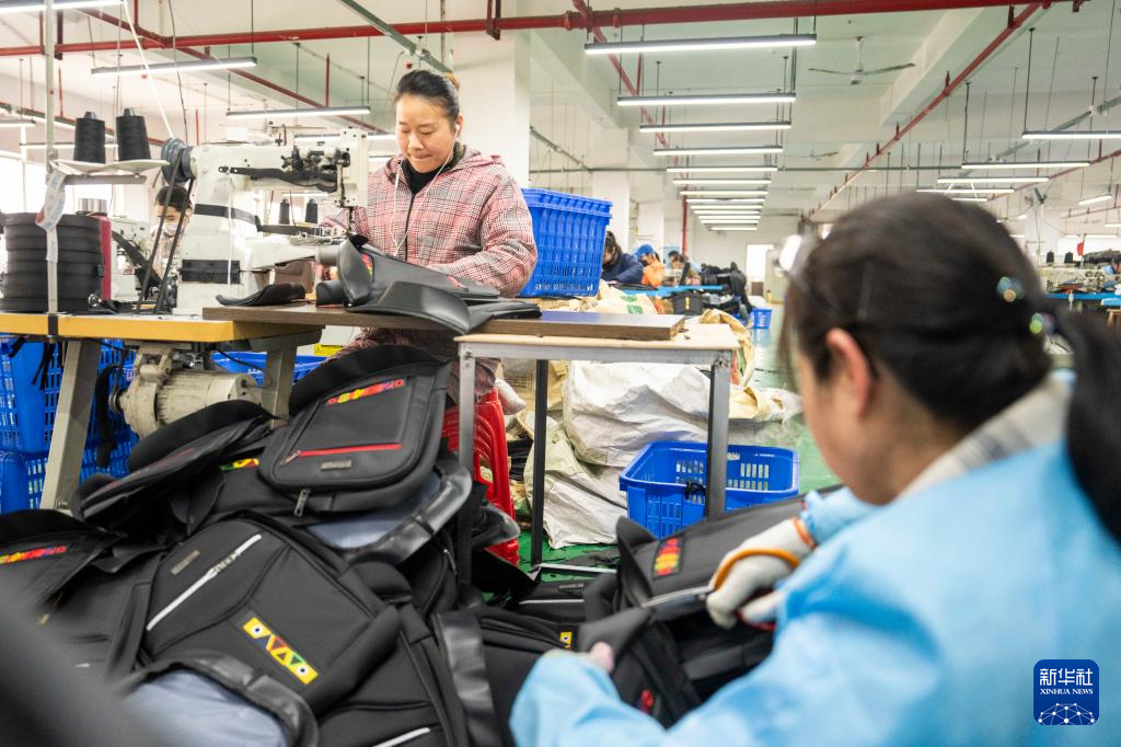 在湖南沅江长盈皮具有限责任公司,工人在制作出口非洲的双肩包(3月12日摄)。新华社记者 陈思汗 摄