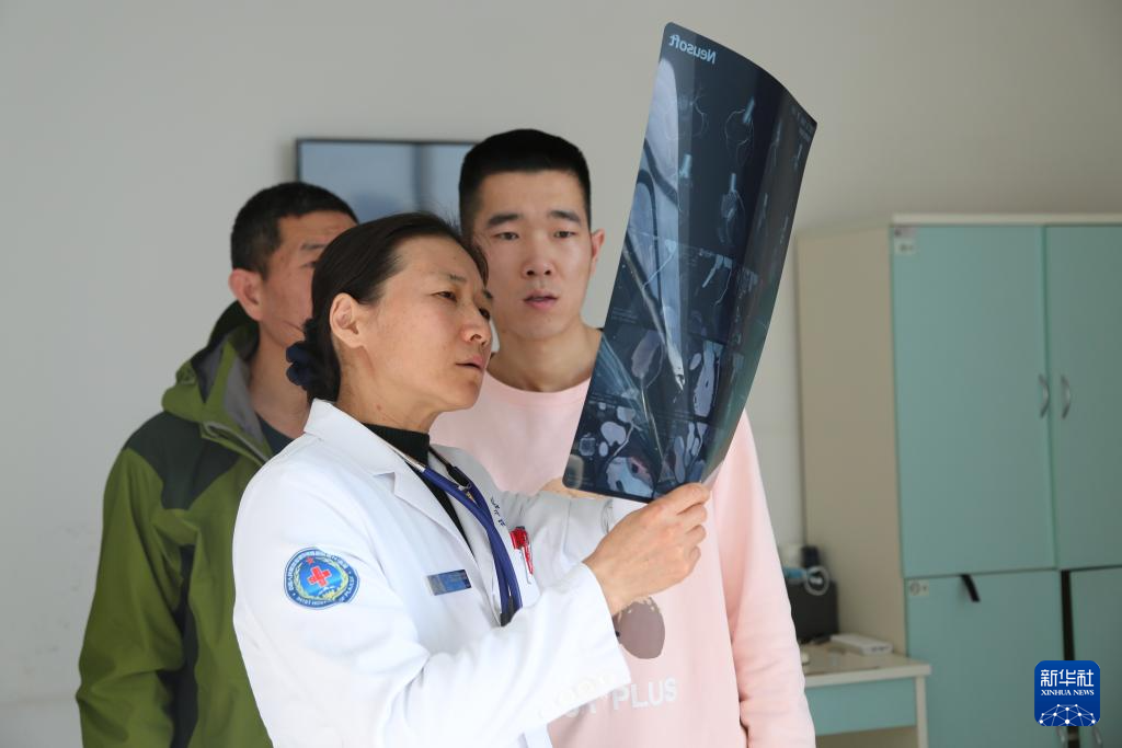 联勤保障部队第941医院重症医学科主任张瑛(右)在边防哨所巡诊(2022年3月20日摄)。新华社发(孟钊 摄)