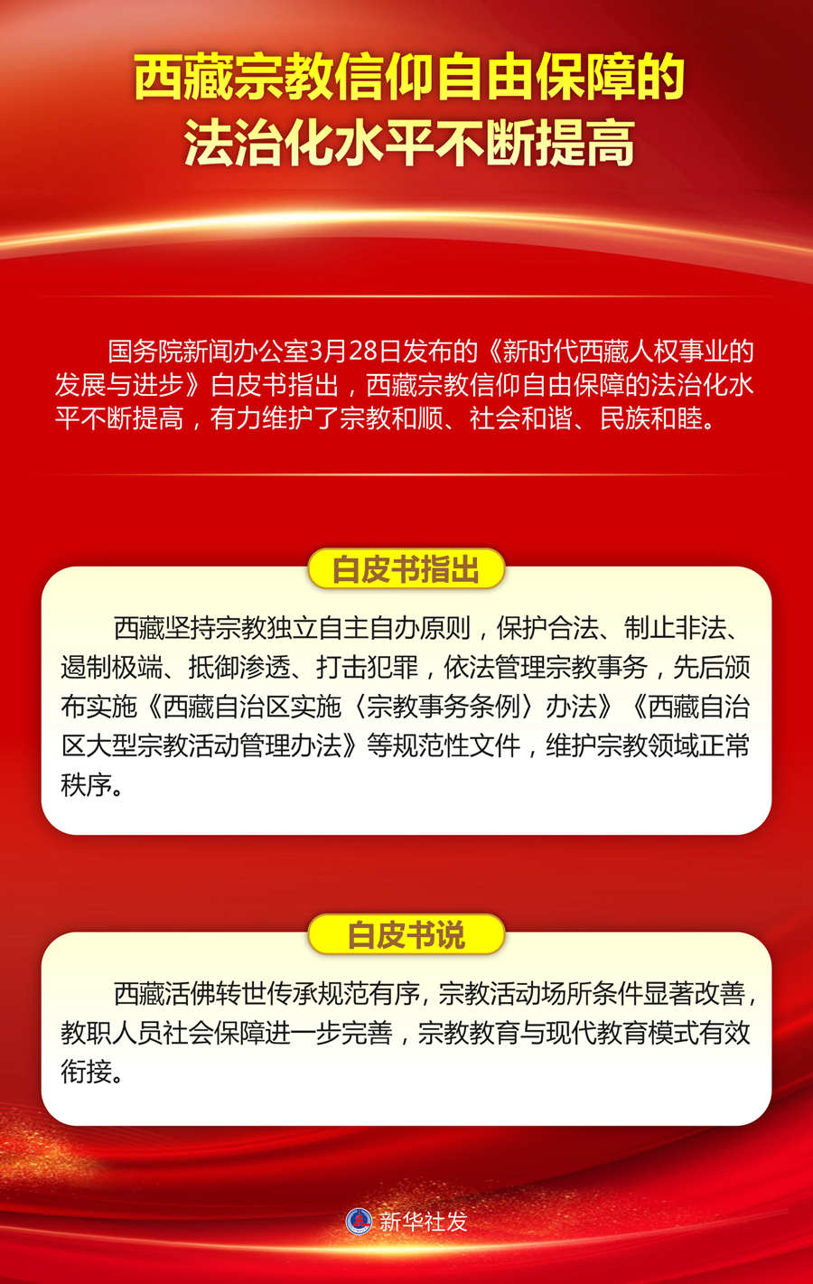白皮书指出,西藏坚持宗教独立自主自办原则,保护合法、制止非法、遏制极端、抵御渗透、打击犯罪,依法管理宗教事务,先后颁布实施《西藏自治区实施〈宗教事务条例〉办法》《西藏自治区大型宗教活动管理办法》等规范性文件,维护宗教领域正常秩序。