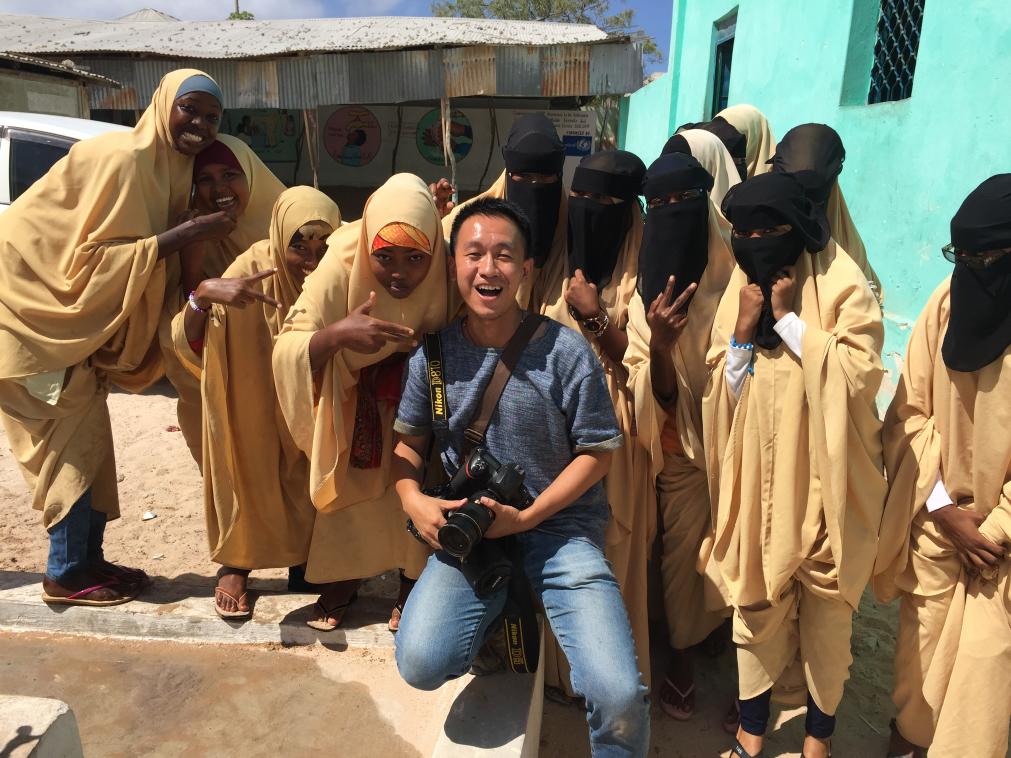 2017年3月22日,孙瑞博(前)在索马里首都摩加迪沙一间学校采访拍摄“世界水日”相关活动时和女学生们交流。