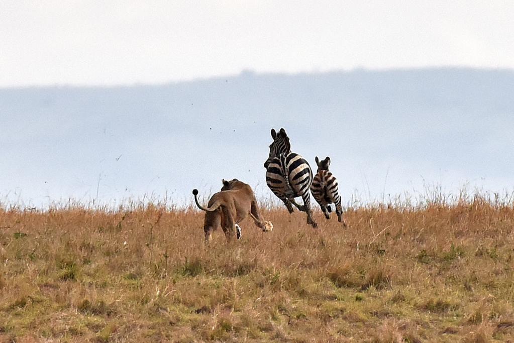 2016年12月31日,在肯尼亚马赛马拉保护区,一头雌狮猎捕斑马。