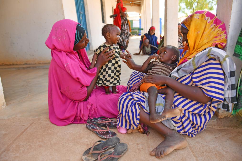 2017年3月20日,在索马里边境城镇多洛的一处营地,两位带着孩子的母亲相互交流。