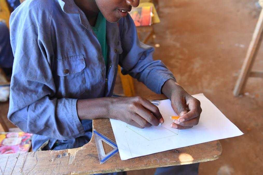 2017年3月22日,在索马里首都摩加迪沙的埃尔曼中心,一名学员绘制机械零件图。