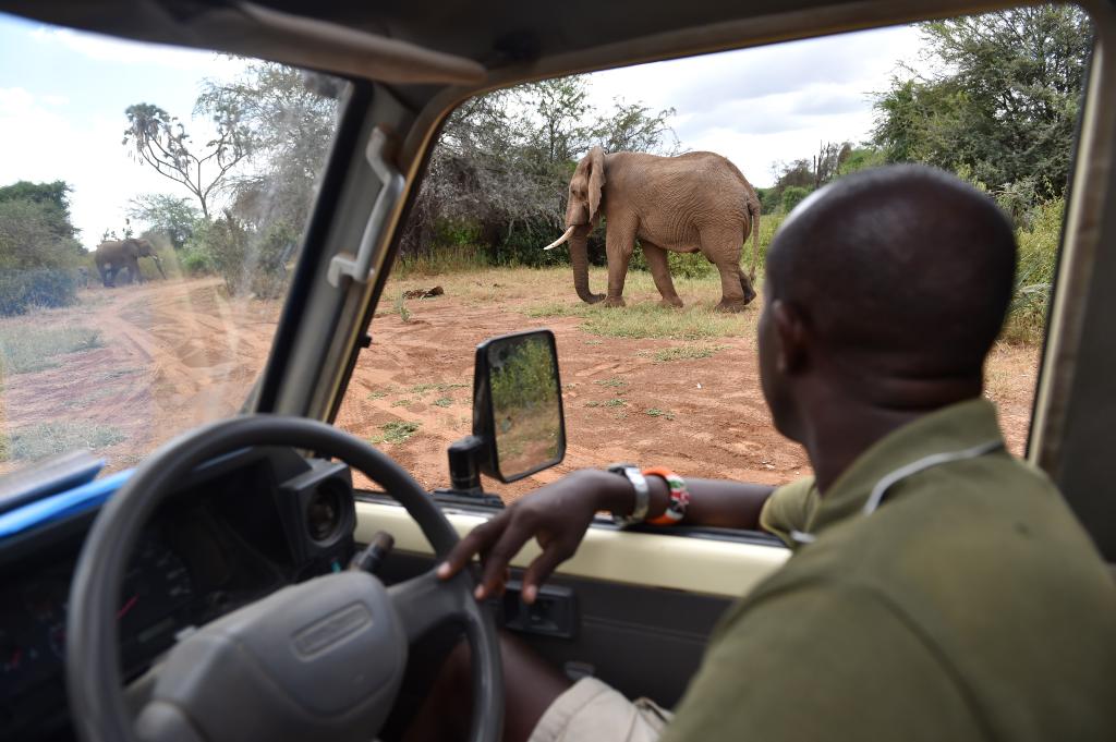 2016年3月1日,在肯尼亚桑布鲁野生动物保护区,“拯救大象”组织的工作人员戴维观察非洲象活动。