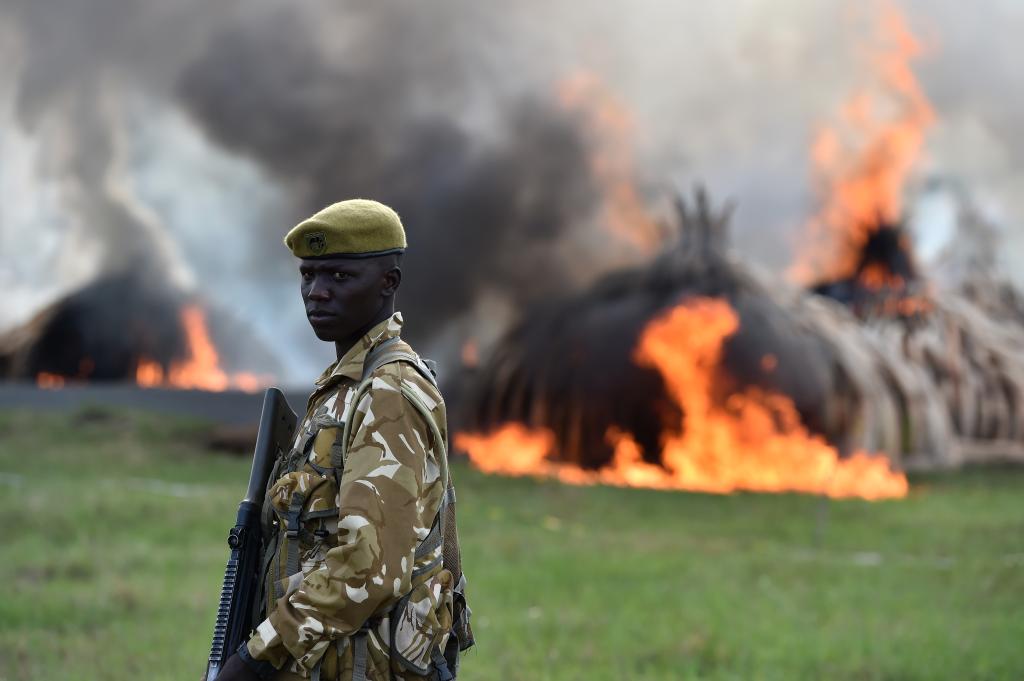 2016年4月30日,在肯尼亚内罗毕,一名野保警察在焚烧象牙和犀牛角的现场警戒。