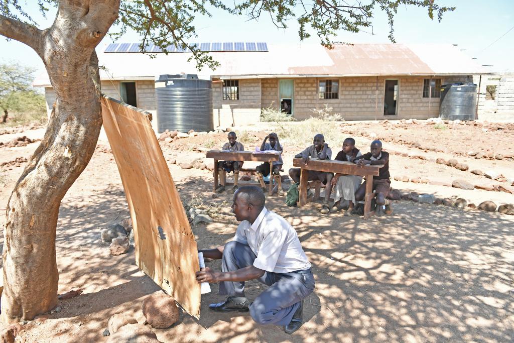 2017年2月15日,在肯尼亚卡贾多郡西奥洛梅依阿纳小学,教师比利在树下上数学课。