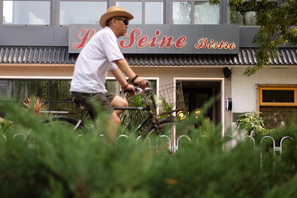 2023年6月25日,一名市民骑车经过北京亮马河畔一家名叫“塞纳河”的西餐厅。
