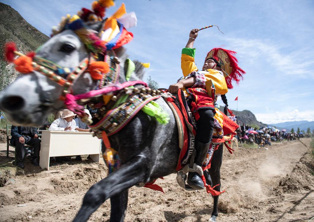 2021年8月26日,位于雅鲁藏布江畔山谷里的西藏山南市贡嘎县昌果乡岗旦村举行一年一度的赛马,迎接即将到来的收获季节。