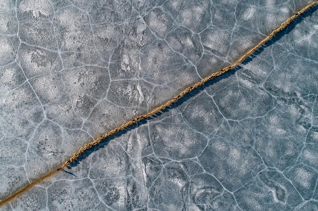 2021年3月6日,羊群顺着安全小路通过普莫雍错冰湖(无人机照片)。
