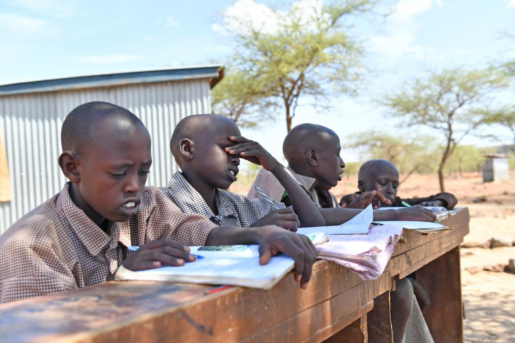 2017年2月15日,在肯尼亚卡贾多郡西奥洛梅依阿纳小学,学生在树下温习功课。