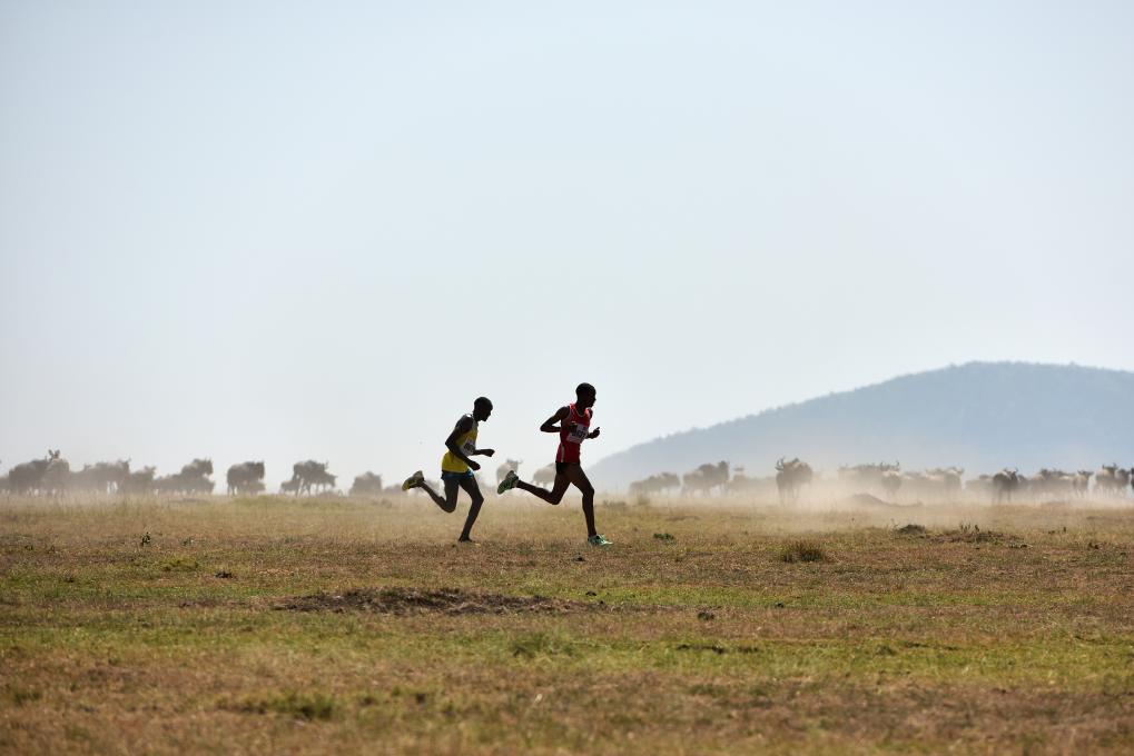 2015年8月15日,第七届马赛马拉马拉松赛选手和野生动物在肯尼亚马赛马拉草原上一起奔跑。