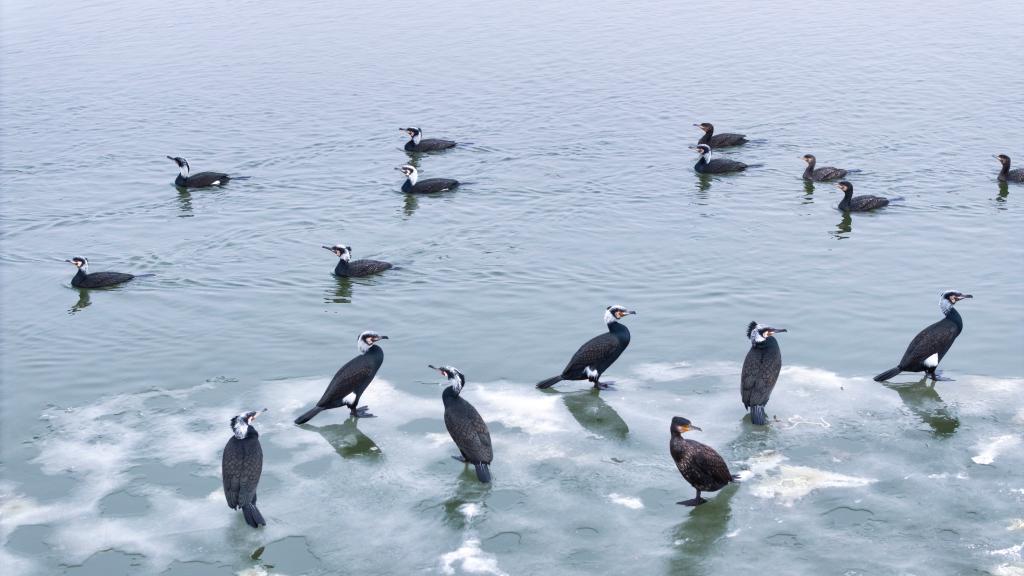 4月1日,在松花江哈尔滨段一处水域,一群鸬鹚在冰面上休息。新华社发(杨威摄)