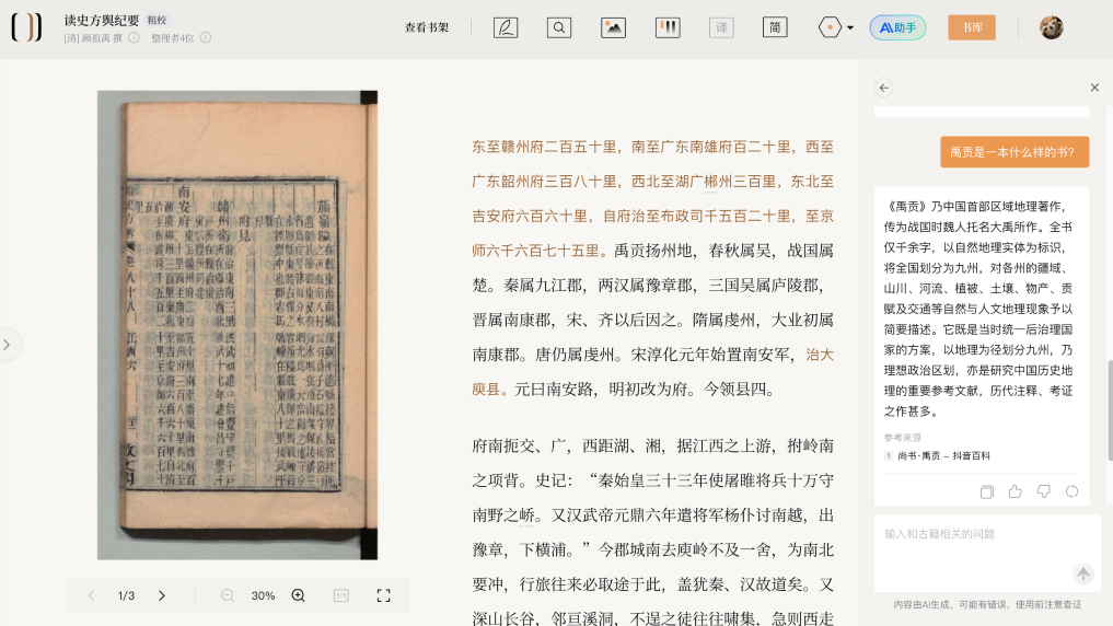 为了帮助读者读懂古籍,平台上线了“古籍智能助手”——选中读不懂的古文原文点击“问AI”,即可获得白话解析。读者还可以和智能助手对话,让它总结文本内容,提出可供参考的研究问题。