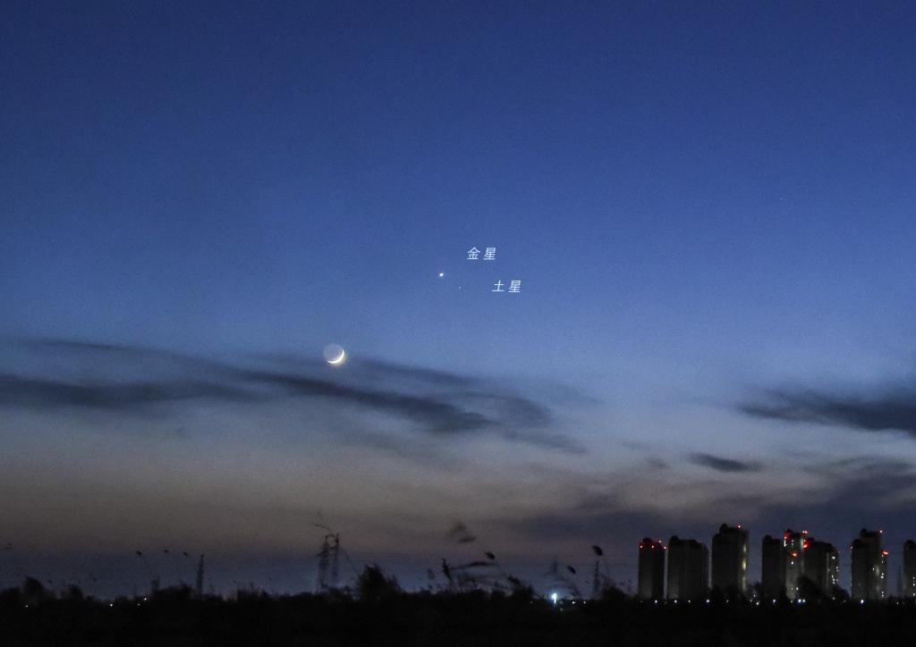 中国天文学会会员、天津市天文学会理事杨婧介绍,4月日出的东方天空里,金星和土星逐渐靠近,上演“星星相吸”。25日这天,农历三月二十八的细细残月也来到这片天区稍作停留,三者刚好组成一个三角形,形成“双星拱月”之势。