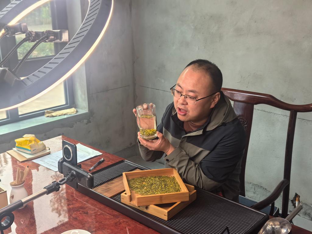 4月27日,王荣国正在直播销售茶叶。新华社记者 任延昕 摄
