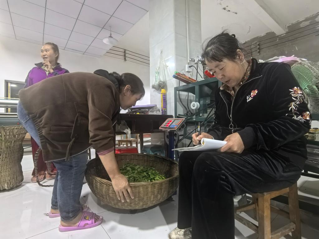 每天的傍晚时分,赵芳家中都格外热闹,前来送鲜叶的茶农络绎不绝。短短二十分钟,便有四五批人鱼贯而入,他们或背着竹篓,或扛着布口袋,满载着当天采摘的茶叶鲜叶。