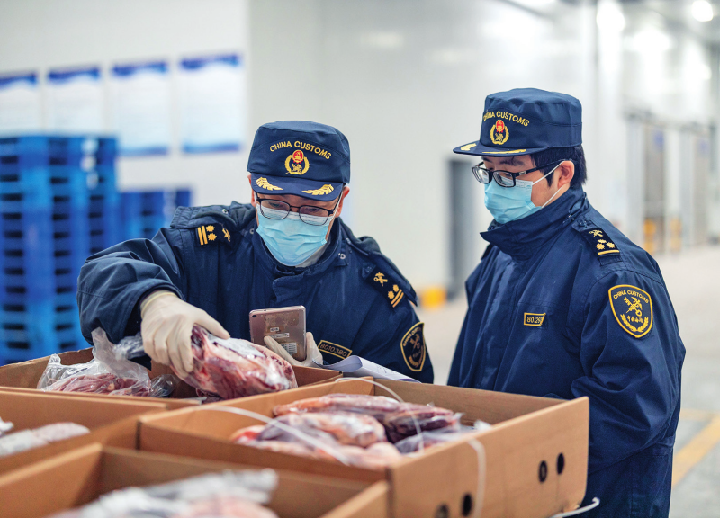 在重庆国际物流枢纽园区,重庆海关所属渝州海关的工作人员正仔细查验通过西部陆海新通道进口的牛肉(2025年1月17日摄)黄伟摄/本刊