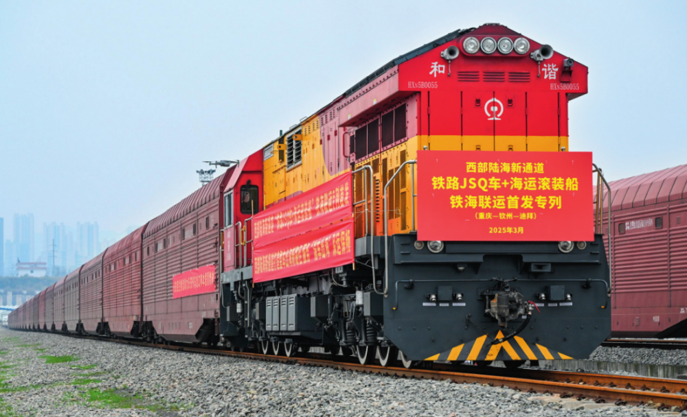 一列满载200台长安汽车的铁路JSQ凹底双层运输汽车专用车专列从重庆鱼嘴站缓缓驶出,将经西部陆海新通道直达广西钦州港后,再通过滚装船发往阿联酋迪拜杰贝阿里港(2025年3月21 日摄)新华社发