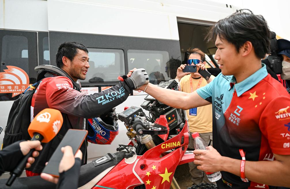 2023年5月23日,在当年的环塔拉力赛上,方明集(左)抵达终点后,与稍早完赛的儿子方响量握手庆祝。新华社记者 胡虎虎 摄
