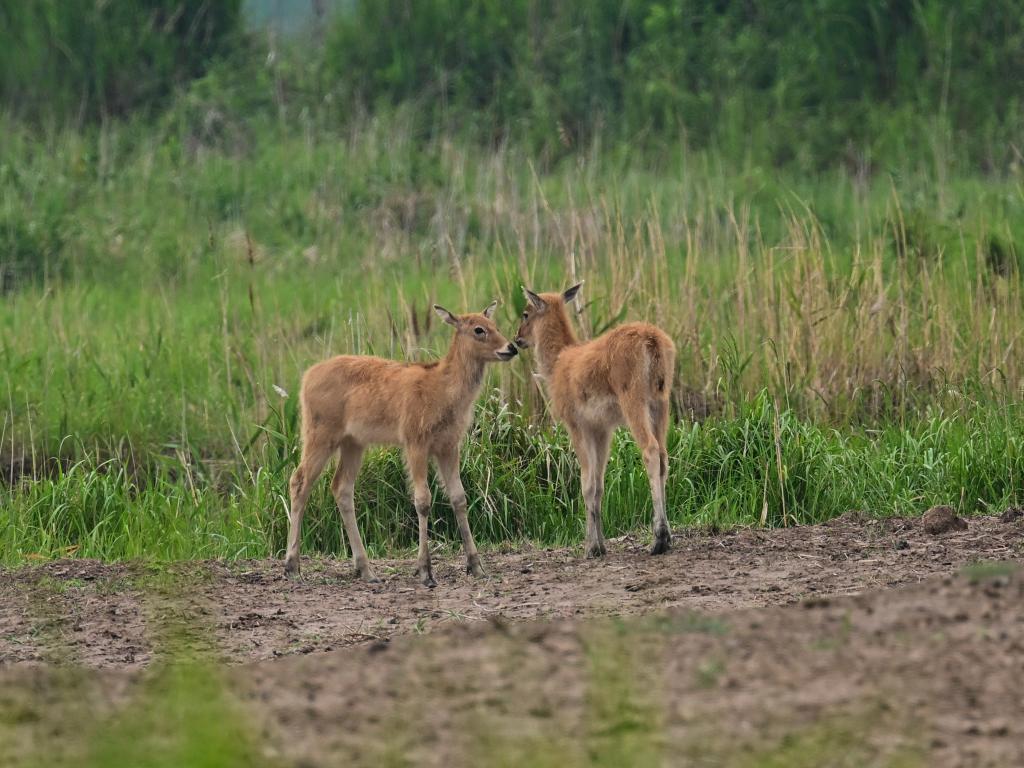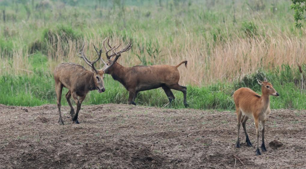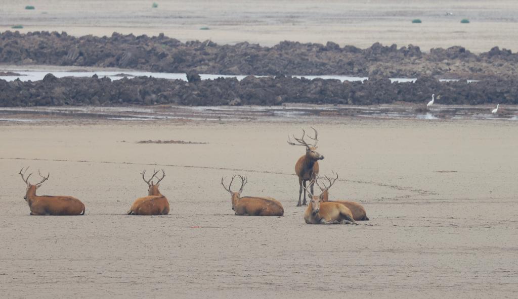 这是6月7日在江苏省盐城市东台条子泥湿地拍摄的麋鹿。