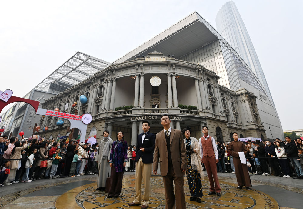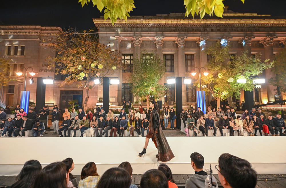 2024年10月26日,模特在天津解放北路上搭起的T台走秀。