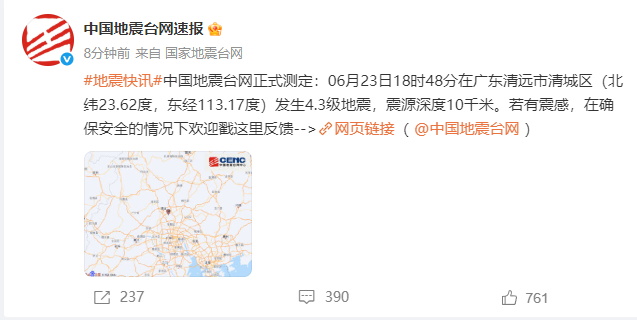 中国地震台网正式测定:6月23日18时48分在广东清远市清城区(北纬23.62度,东经113.17度)发生4.3级地震,震源深度10千米。