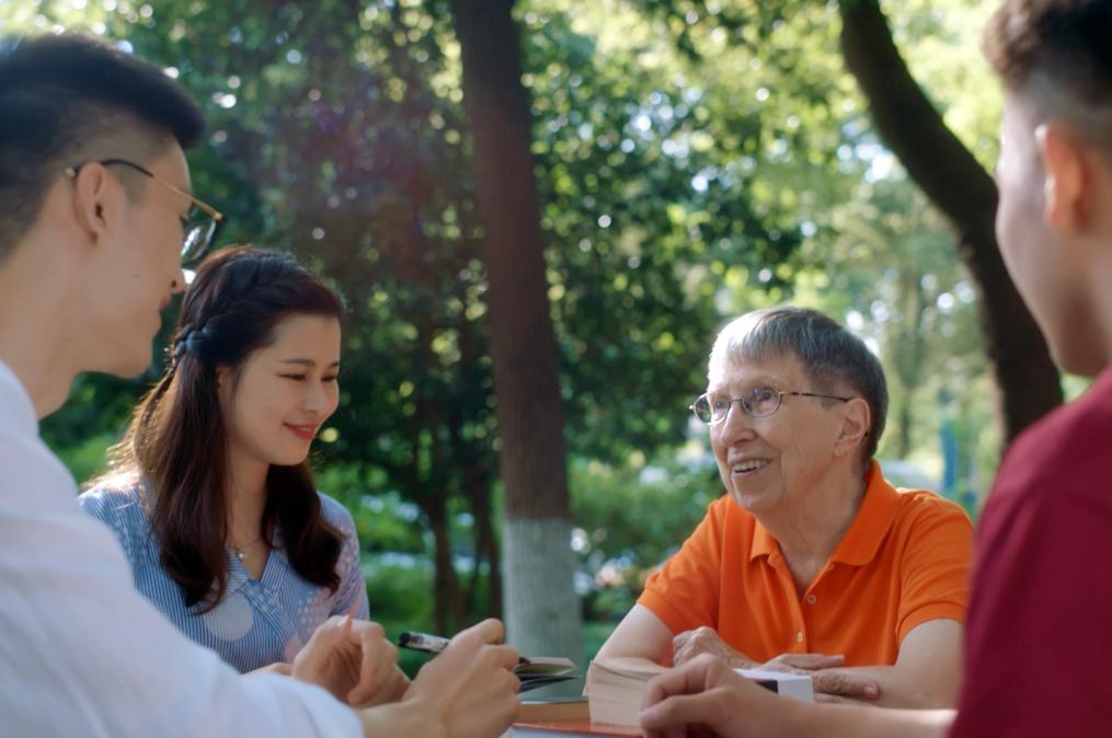 2019年,白丽诗与上海外国语大学的学生在一起。新华社发(上海外国语大学供图)