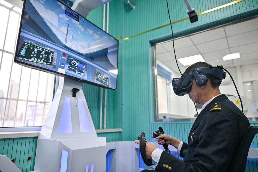 2024年12月19日,在国铁北京动车段北京北动车运用所,动车组司机安秀旗使用VR模拟驾驶设备训练。新华社记者 孙瑞博 摄
